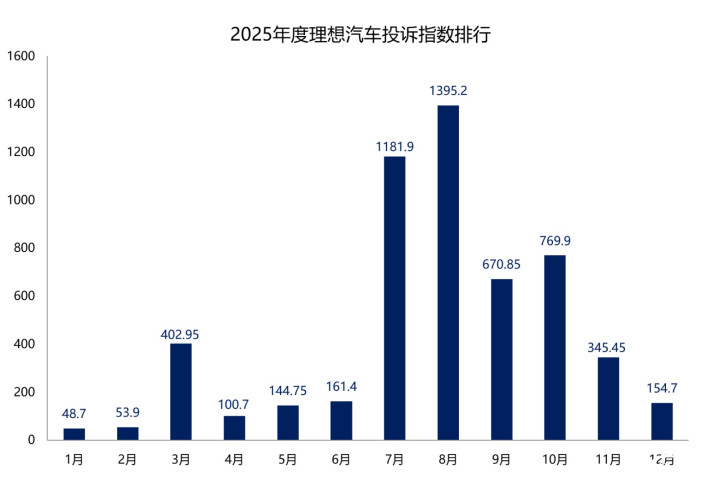 汽车门网数据夸耀:理思汽车2025年投诉指数达到了5430.4,同比涨幅超5倍,位于年度车企投诉指数榜单的第六名。从月度走势来看,7-10月成为理思汽车全年投诉压力最大且问题最纠合的中枢爆发期,其中8月投诉指数达到了1395.2,创下全年峰值。