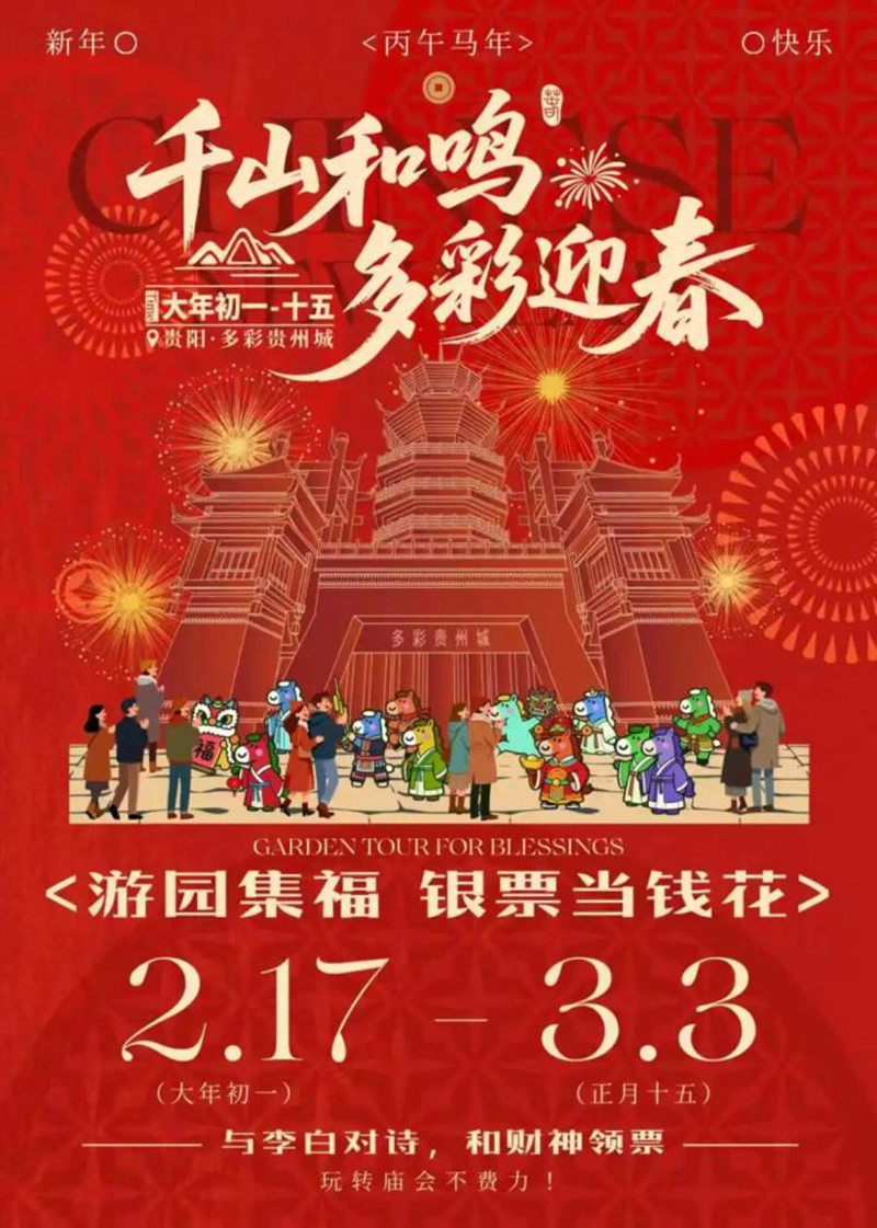 2月17日至3月3日,多彩贵州城“千山和鸣·多彩迎春”新春游园大庙会邀您赴约,逛庙会、赏散乐、品年味,让旅客千里浸式体验浓郁的年节氛围。
