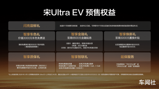 2026年3月5日,比亚迪王朝B级闪充SUV 宋Ultra EV庄重开启预售,全系搭载比亚迪第二代刀片电板及闪充技能,同期配备多项奢适树立。新车预售价15.5-18.5万元。同期,预订用户还将享受整整18个月免费闪充职权。