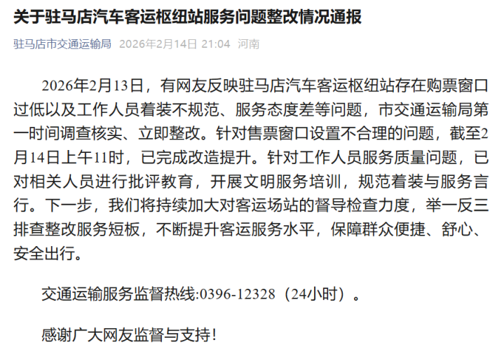 2月14日,驻马店市交通运载局发布整改情况通报: