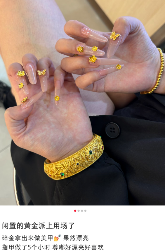 周大福等头部品牌的小件金饰,致使老铺黄金的金条齐成了好意思甲店的“高端原料”,有消耗者暗意,顺目眩数千元、上万元打造“黄金甲”。