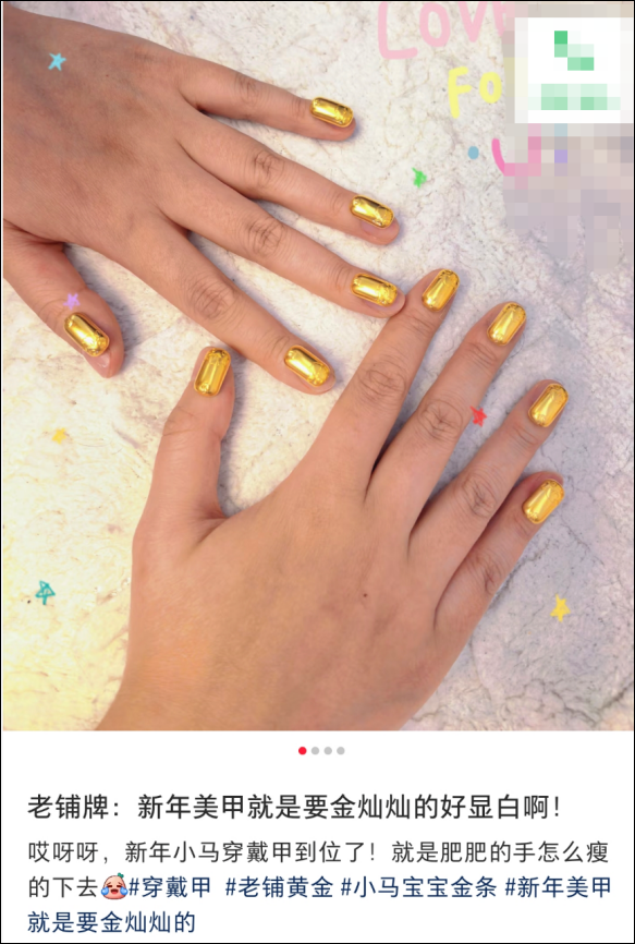 为了追求极致后果,致使有网友将老铺黄金的“生肖金条”系列(分量可高达10克)搬上指甲。